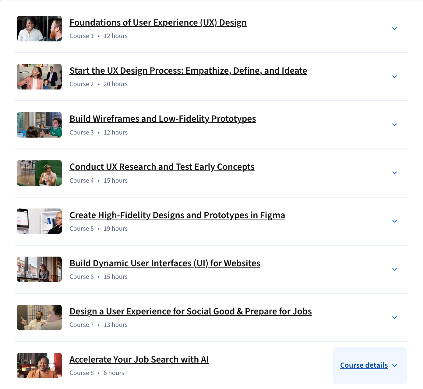 What you produce during the course can become the “base version”. After the certificate, you can refine visuals, rewrite the case study, improve prototypes, and make it look much more professional.