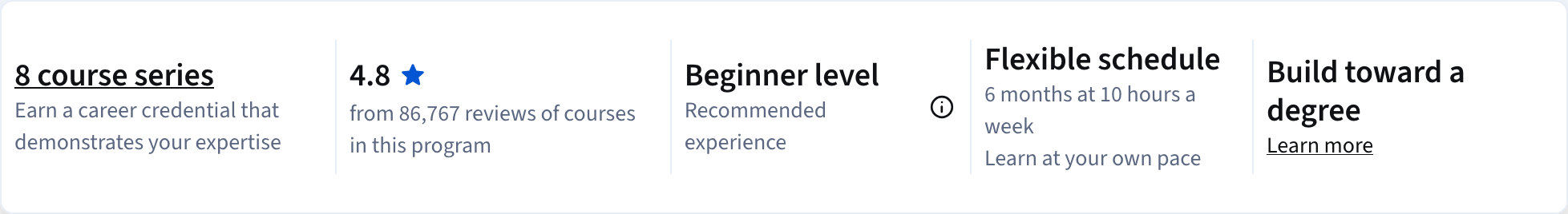 The certificate is divided into multiple courses (basically a series). Each part builds on the last one.